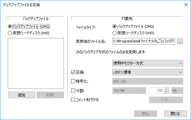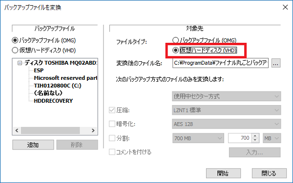Note: 仮想ハードディスクファイルへ変換する際に、圧縮、暗号化、分割、コメント付与のオプションは選択できません。また、基となるバックアップファイルのバックアップ方式は、使用中セクター方式のみを使用できます。