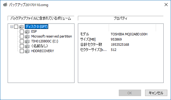 Note: バックアップファイルは、バックアップしたときに指定した場所(外付けハードディスク、ネットワークドライブなど)にあります。 - ディスク全体にチェックを入れて「OK」ボタンをクリックします。