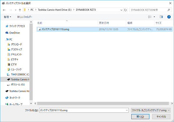 - 変換したいバックアップファイルを選択して「開く」ボタンをクリックします。